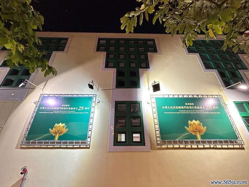 12月16日晚,澳门官也街隔邻的建筑外墙上,挂着写有庆祝澳门回来故国25周年口号的宣传牌,底色是显著的澳门特戋戋旗的绿色,标记着和平好意思好。中青报·中青网记者 宁迪/摄