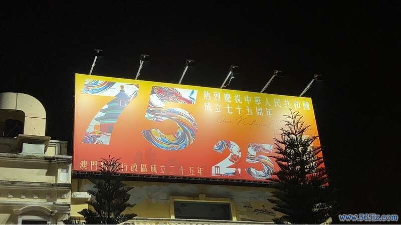 12月16日晚,在澳门官也街一座建筑的顶部,挂着一副庆祝新中国建树75周年和澳门回来故国25周年的宣传牌。中青报·中青网记者 宁迪/摄