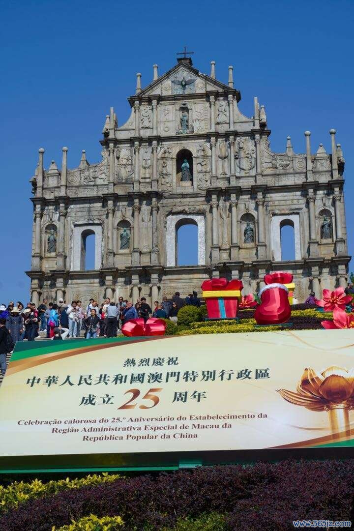 12月17日,澳门知名景点大三巴牌楼前,摆放着深广的澳门回来故国25周年的庆祝宣传牌。中青报·中青网记者 宋继祥/摄