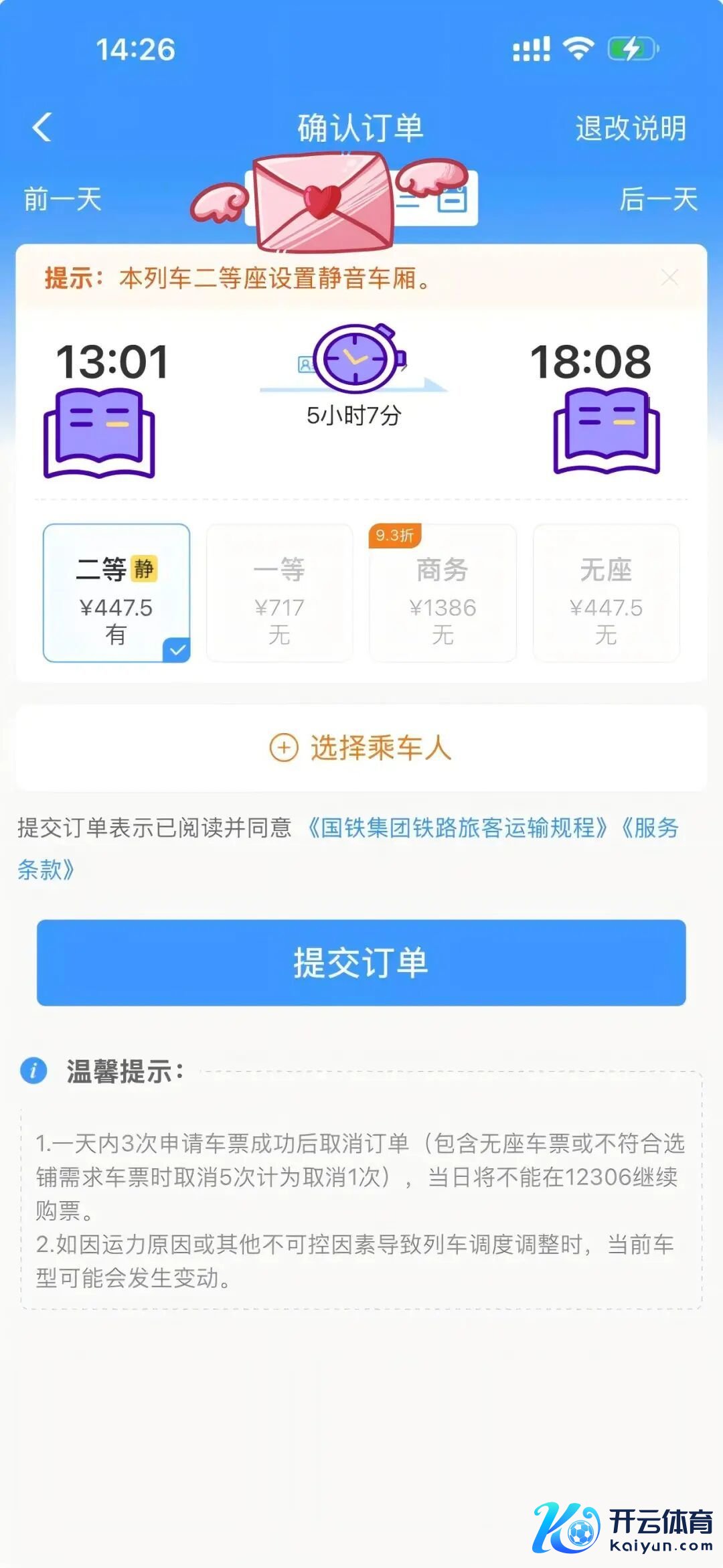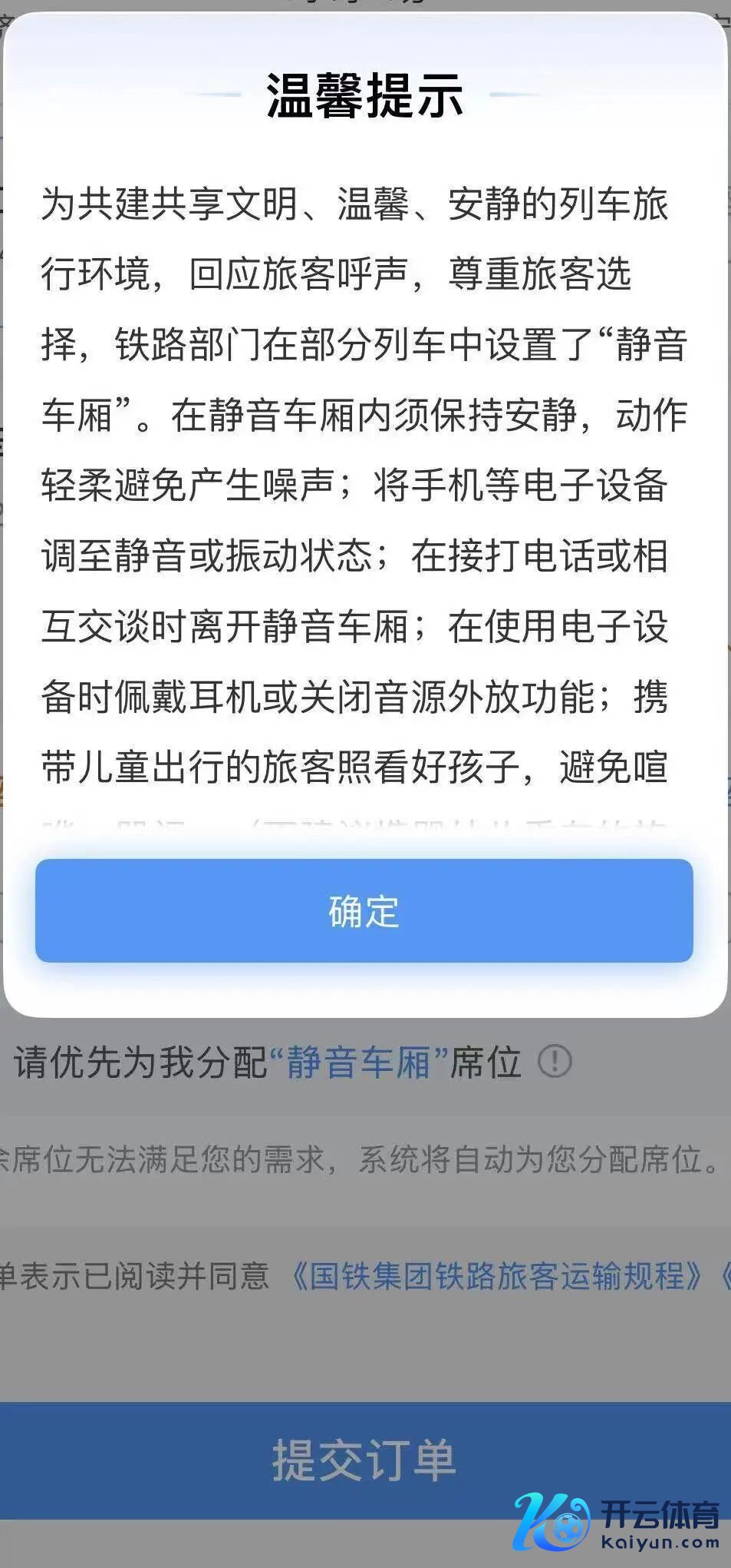 出差,在12306上买票,选好车次后开云体育,看到有静音车厢的提醒。