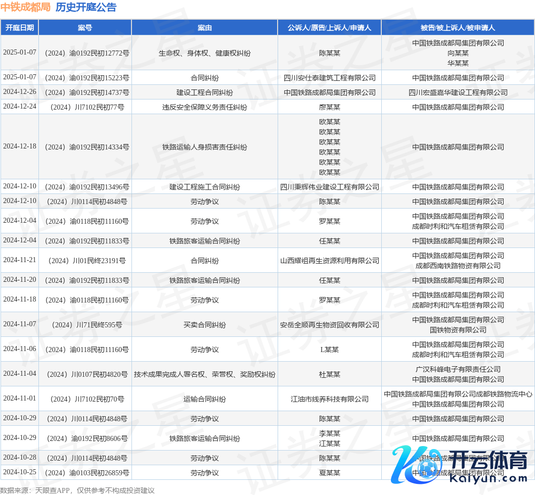 本站音书,字据天眼查APP融会,近日公布了一则中国铁路成皆局集团有限公司当作被告/被上诉东谈主的开庭公告,扫视骨子如下: