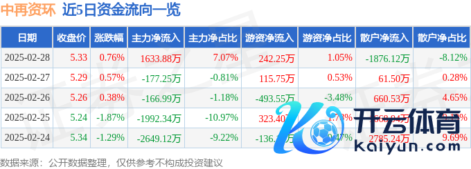 本站音问,终了2025年2月28日收盘,中再资环(600217)报收于5.33元,高潮0.76%,换手率2.63%,成交量43.54万手,成交额2.31亿元。